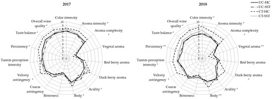 Variation in sensory characteristics of wines from seasons 2017 and 2018 for te different combinations of treatments (FC-HC—full crop combined with high canopy; FC-SST—full crop combined with severe shoot trimming; CT-HC—cluster thinning combined with high canopy; and CT-SST—cluster thinning combined with severe shoot trimming). Data were analyzed via one-way ANOVA in randomized blocks design (*, p ≤ 0.05; **, p ≤ 0.01; not significant if not indicated by an asterisk).