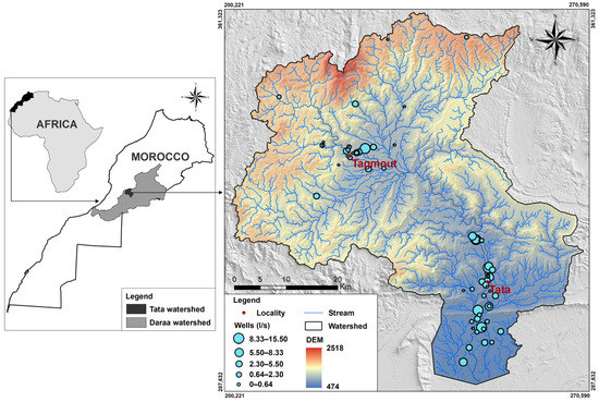 The Tata watershed, with an area of 2567 km2, is a well-individualized hydrographical system of the Anti-Atlas mountain chain. It is situated in the province of Tata in the southeastern part of Morocco, between Lambert coordinates X (200,000 and 280,000) and Y (290,000 and 360,000) (Figure 1).