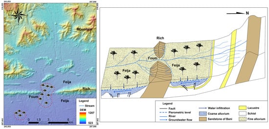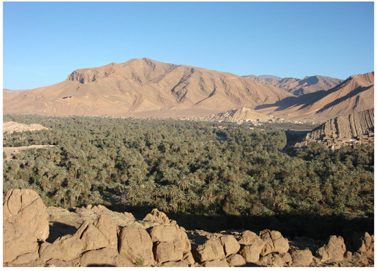 In economic terms, agriculture is the main activity in the region, with 5500 hectares of irrigated land [15]. It is developed at the oases where traditional palm groves are irrigated from alluvial aquifers by khettaras, wells, and resurgences [24,25] (Figure 2).