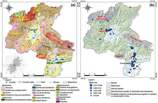 (a) Geological map of the Tata watershed; and (b) Map of different types of aquifer systems in the study area.