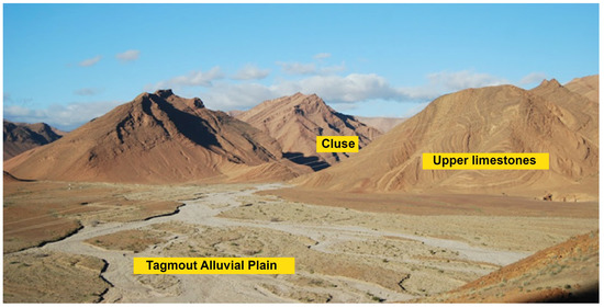 Geologically, the basin is occupied by Precambrian formations composed of granite, gabbro, and schist at the Ighrem, Tagragra, and Agouliz inliers (Figure 3a). The Paleozoic cover occupies a large part of the basin, including volcano-sedimentary deposits progressing to carbonate deposits of “Lower limestones” topped with pelites of a purplish-red color “Lie-de-vin” followed by carbonate deposits of “Upper limestones” and schists–calcareous series [26,27,28,29,30,31,32,33,34]. Sandstones and quartzites of the Ordovician age occupy the southern part of the basin, followed by Devonian shale and limestone [35,36]. Alluvial deposits fill the valleys and form alluvial aquifers [23] (Figure 3b and Figure 4). Structurally, three major fault directions exist in the basin: NNE–SSW, NE–SW, and E–W [27] (Figure 3a). NE–SW sills and doleritic dykes related to the opening of the Atlantic Ocean in the Triassic/Lias period traverse all these terrains [37].