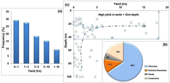 (a) Frequency histograms of wells yield (L/s) for the Tata watershed; (b) Percentage of wells exploiting different kinds of geological formations; and (c) Correlation between yield and depth of wells.