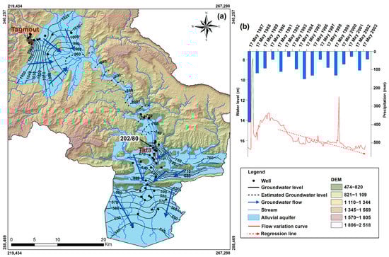 (a) Piezometric map of the Tata alluvial aquifer (March 2016), (b) Evolution of the water/soil level at well 202/80.