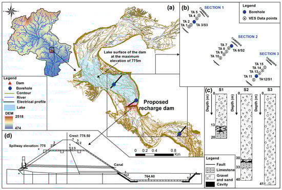 (a) Topographic detailed map of the geophysical prospecting profiles and location of proposed recharge dam, (b) Locations of VES stations, (c) Borehole lithology description, and (d) Architectural plan of recharge dam.
