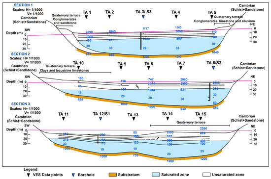 - Section 1 shows alternating resistive and conductive layers (Figure 10). The alluvium formations above the piezometric level (PL) are resistant. Those below the PL have low resistivity whose origin can be due to the impact of water or, possibly, the existence of clayey elements in this layer. The resistant bedrock, not reached by the mechanical borehole S3, is estimated at a depth of 41, 50, and 52 m at TA5, TA3, and TA4 VESs. This geo-electrical section shows this alluvial aquifer’s significant potential (average of 50 m).