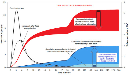In total, 1.6 million cubic meters of water infiltrate into the recharge dam basin and 3.6 million cubic meters of water exit from the future dam. The volume of water infiltrated into the alluvium downstream of the future dam is estimated to be 0.3 million m3 (6% of the total floodwater volume), and the volume of water flowing downstream is estimated to be 3.3 million m3 (63% of the total floodwater volume).
