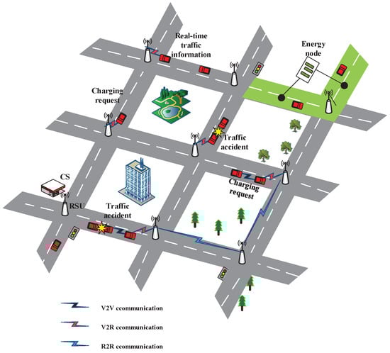 There is a significant body of literature on the path-planning and charging scheduling problem. Recent works have explored the use of VANETs to transmit traffic information and aid electric vehicles in making travel decisions. For example, Li et al. proposed vehicle-to-everything communication based on VANETs to enable transmission between electric vehicles and mobile edge computing servers for V2V charging navigation []. Wang et al. developed an intelligent power distribution system that used VANETs to enable communication among electric vehicles, RSUs, and a vehicle–traffic server, and proposed a globally optimal online electric-vehicle-charging strategy []. However, these centralized approaches can be computationally expensive, particularly in complex traffic networks. Bi et al. proposed communication based on clustering vehicular ad hoc networks for electric vehicles (EV-VANET), in which a cluster leader collected and maintained information for cluster members and transmitted information between adjacent clusters and RSUs []. However, this work did not consider real-time information transmission.