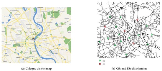 To carry out the simulation experiment, we select a real urban traffic scene in Cologne, Germany, and use Java open street map (JOSM) [] to extract the main traffic network in Figure 4a. The number and distribution of charging infrastructures are shown in Figure 4b, where the number and distribution of CSs follow the information in []. ESs are randomly distributed, and considering that the deployment cost of ESs is higher than that of CSs, the number of ESs will be less than the number of CSs in the paper. The details of the map and other parameters required for the simulation are shown in Table 4.