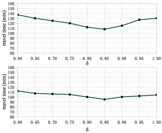 Since the size of affects the maximum road load and search range for path-planning, it has an impact on vehicle path optimization and the resulting travel time. Therefore, it is important to determine an appropriate value for to minimize travel time. To evaluate the impact of , is set to different values for further study. It starts at 0.6 and increases in small steps of 0.05. As shown in Figure 5, it is the travel time when takes different values from 7:00 a.m. to 8:00 a.m. and 2:00 p.m. to 3:00 p.m., respectively. If the value of is too small, the travel distance of the vehicle will increase due to detour, which will increase the travel time. However, if is too large, the number of vehicles on the road will increase, resulting in congestion, which will also increase the travel time. When , the travel time spent reaches a relatively minimum value. Therefore, we set to 0.85 in all evaluations.