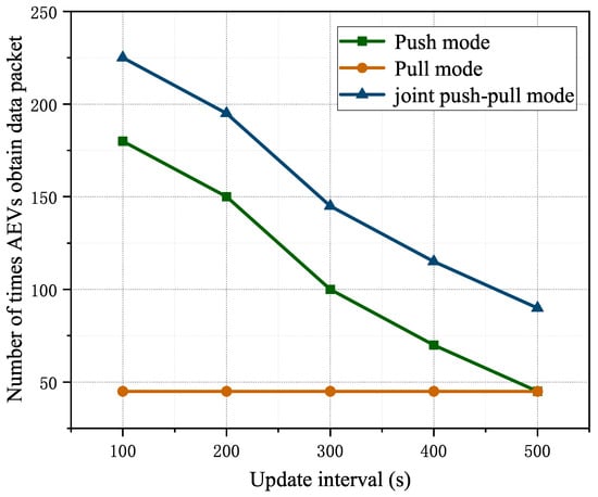 The number of times AEVs obtain information is selected to evaluate the joint push–pull communication mode and performance comparison in simulation. This refers to the total number of times that all AEVs obtain information from RSUs. Considering the existing urban traffic conditions, the vehicle speed in the simulation is set randomly between 25 and 60 km/h. A 25-meter wireless communication range is selected for AEVs, and 250-meter communication range is applied for RSUs. The simulation is run with 50 vehicles for a duration of 1000 s. If all AEVs within the communication range of the intersection can receive the data packet sent by the RSU during the information update time, without considering packet loss. Figure 6 shows the number of times AEVs obtain information between push mode, pull mode, and joint push–pull mode. We can observe that as the update time interval increases, there is a decrease in the amount of information obtained through both the push and joint push–pull modes, while the pull mode remains relatively stable. This is because the longer update time intervals provide fewer opportunities for vehicles to receive information from the RSUs in the push and joint push–pull modes, while the pull mode relies on vehicles actively requesting information from the RSUs. In terms of performance, the push mode outperforms the pull mode, which can be attributed to the push mode’s ability to proactively provide information to vehicles. Additionally, the joint push–pull mode outperforms the push mode, as it combines the advantages of both push and pull modes. The point push–pull mode allows vehicles to receive up-to-date information from RSUs while also being able to actively request information when needed.