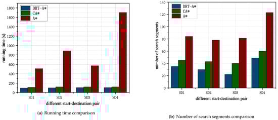 Figure 7a shows the running time comparison of different start–destination pairs between the A* algorithm, DRT-A* algorithm, and constrained A* shortest-path (CA*) algorithm in []. We set the starting nodes of these four start–destination pairs as the same starting node, but the destinations are different. We can observe that for four different start–destination pairs, the running time of the DRT-A* algorithm and CA* is less than the A* algorithm. In particular, when the distance from the start node to the destination becomes larger, compared with the A* algorithm, DRT-A* algorithm and CA* have more advantages in the running time. Figure 7b shows the comparison of the number of search segments between the A* algorithm, DRT-A* algorithm, and the CA*. We can observe that compared with the A* algorithm and CA*, the number of road segments searched by the DRT-A* algorithm is effectively reduced. As a result, the DRT-A* algorithm demonstrates superior performance compared to both the A* algorithm and the CA* algorithm in terms of reducing the search space and the number of road segments.