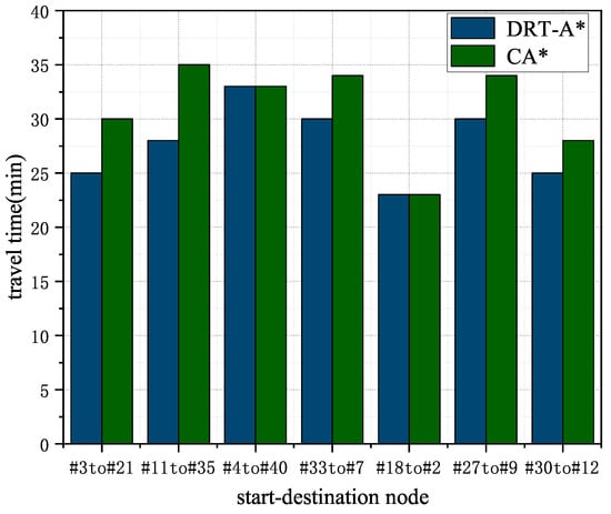 Figure 8 shows the comparison of AEV travel time for DRT-A* with CA* in different start–destination nodes. We can observe that the travel time with our DRT-A* algorithm is lower than or equal to the CA* algorithm. The DRT-A* algorithm can replan the original path based on updating real-time traffic information so that the traveling time estimation is much more accurate than the CA* algorithm. Furthermore, our DRT-A* algorithm considers the TFD constraint of the road segment in the path-planning, which can alleviate traffic congestion and reduce travel time. Each path can arrive at the destination, which verifies our proposed algorithm’s convergence. The average performance deviation between our proposed method and the CA* approach in terms of travel time is 2.87 min. Figure 9 shows the computation time for each of the instances. It can be observed that the computation time with our DRT-A* algorithm is lower than the CA* algorithm. The DRT-A* algorithm improved the average performance by 27.8% compared to the CA* algorithm, and the computation time for each instance is very close, with a difference of less than 8% between the maximum and minimum computation times. The results demonstrate the efficiency of the DRT-A* algorithm in finding optimal paths for AEVs in urban traffic networks while reducing travel time and computation time.