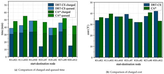 Figure 10a shows the comparison of AEV charged time and queued time for DRT-CS with CA* in different start–destination pairs. The charged time obtained here is when the charging rate is 70 kWh. We can observe that the queue time with our DRT-A* algorithm is lower than or equal to CA* algorithm in start–destination , , , and . The DRT-CS algorithm can select the charging infrastructure based on updating the number of queued vehicles and the service status of charging slots so that the queue time estimation is much more accurate. The travel path planned by the CA* algorithm takes more time compared to the DRT-A* algorithm in start–destination , and , which causes AEVs to consume more charge. As a result, when all AEVs are charged to 90% of their battery capacity, the charging time will be longer to compensate for the higher energy consumption. In DRT-CS, we can observe that there is no queued time in start–destination ,, and the charged time is also relatively short. This is because the vehicle chooses to charge at the ES, and the charging capacity does not reach 90%. The average performance deviation between our proposed method and the CA* approach in terms of charging time and queuing time is 6.11 min and 4.85 min, respectively. Figure 10b shows the charged cost of the vehicle. The unit charging price of charge station is RMB 1.1, and the unit charging price of ES is RMB 2.8. In the travel of start–destination , and , when the AEV’s battery is charged to 90% capacity, AEV will require more charge with CA* algorithm compared to the DRT-CS algorithm. As a result, the AEV needs to pay for more charge with the same unit charging price. The mobile charging service provided by ES for AEV does not require queued time compared with charge station. However, due to the length limitation of ES, the charged capacity of vehicles may not reach 90%, and the charged cost will be higher than charge station.