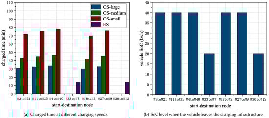 Figure 11a shows the charged time of the vehicle at different charged speeds in the selected charging infrastructure. We can observe that the charged time required in ES in start–destination and is less than the minimum charging time in charge station, because the charging capacity in ES is less than that in charge station. Choosing a charging slot with a faster charging rate reduces the charging time required but increases the charging cost. Therefore, the vehicle can select a charging slot based on its individual needs. Figure 11b shows the SoC when the vehicle leaves the charging infrastructure. Due to the limited length of the ES, it may not be able to charge a vehicle up to 90%. Nevertheless, its flexible charging mode provides more convenient charging opportunities for vehicles in urgent need of power replenishment or those close to their destination.