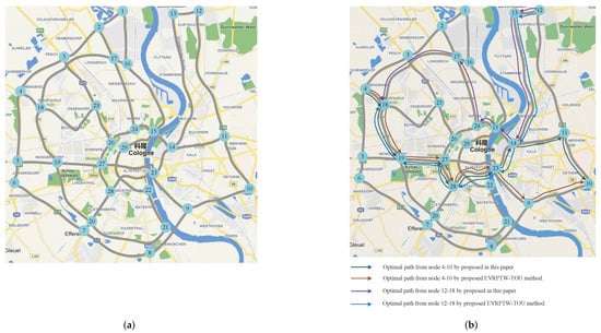 The dynamic changes in the traffic conditions and service status of charging infrastructures require the navigation approach and charging selection to be adaptive. The real-time information is updated by joint push–pull mode. The optimal path for AEVs is rescheduled with real-time data according to their current locations and real-time system conditions. Due to heavy road congestion on the road segments and . AEV 4 reschedules its path from 4-18-19-27-28-23-9-10 to 4-18-19-27-28-23-14-11-10. Since is now fully loaded, AEV 12 is navigated to charge at . The schedule navigation results for AEV 4 and 12 proposed in this paper and the electric-vehicle routing problem with time windows and time of use prices (EVRPTW-TOU) in [] are shown in Figure 12b. The results demonstrate that the proposed dynamic optimization can reschedule the optimal path and charging selection promptly in response to system parameter variations.