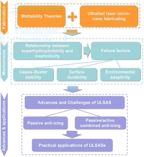 - Tang, B.-H.; Wang, Q.; Han, X.-C.; Zhou, H.; Yan, X.-J.; Yu, Y.; Han, D.-D. Fabrication of anti-icing/de-icing surfaces by femtosecond laser. Front. Chem. 2022, 10, 1073473. [Google Scholar] [CrossRef]