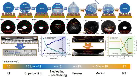 - Hou, Y.; Yu, M.; Shang, Y.; Zhou, P.; Song, R.; Xu, X.; Chen, X.; Wang, Z.; Yao, S. Suppressing Ice Nucleation of Supercooled Condensate with Biphilic Topography. Phys. Rev. Lett. 2018, 120, 075902. [Google Scholar] [CrossRef] [PubMed]