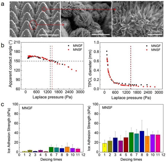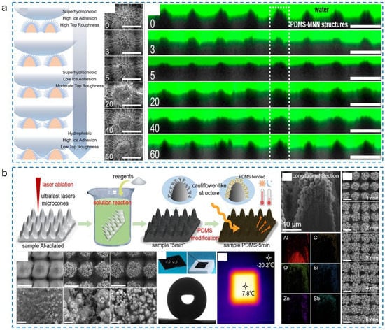 - Chen, C.; Tian, Z.; Luo, X.; Jiang, G.; Hu, X.; Wang, L.; Peng, R.; Zhang, H.; Zhong, M. Micro–Nano-Nanowire Triple Structure-Held PDMS Superhydrophobic Surfaces for Robust Ultra-Long-Term Icephobic Performance. ACS Appl. Mater. Interfaces 2022, 14, 23973–23982. [Google Scholar] [CrossRef]
