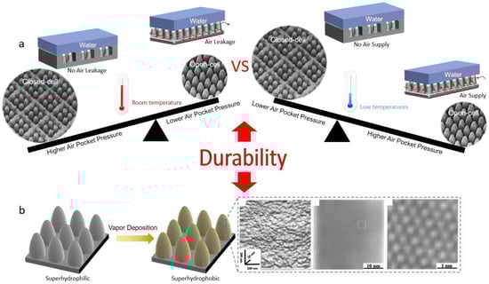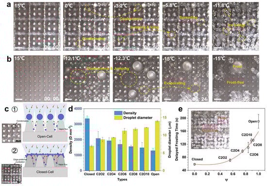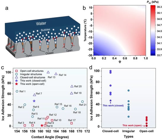 - Wang, L.; Jiang, G.; Tian, Z.; Chen, C.; Hu, X.; Peng, R.; Zhang, H.; Fan, P.; Zhong, M. Superhydrophobic microstructures for better anti-icing performances: Open-cell or closed-cell? Mater. Horiz. 2023, 10, 209–220. [Google Scholar] [CrossRef]