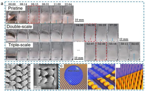 - Pan, R.; Cai, M.; Liu, W.; Luo, X.; Chen, C.; Zhang, H.; Zhong, M. Extremely high Cassie-Baxter state stability of superhydrophobic surfaces via precisely tunable dual-scale and triple-scale micro-nano structures. J. Mater. Chem. A 2019, 7, 18050–18062. [Google Scholar] [CrossRef]