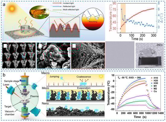 - Zhang, H.; Zhao, G.; Wu, S.; Alsaid, Y.; Zhao, W.; Yan, X.; Liu, L.; Zou, G.; Lv, J.; He, X.; et al. Solar anti-icing surface with enhanced condensate self-removing at extreme environmental conditions. Proc. Natl. Acad. Sci. USA 2021, 118, e2100978118. [Google Scholar] [CrossRef]