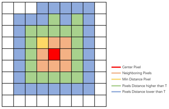 For each ( pixel in the image), we calculated the correlation distance between it and surrounding pixels, taking a minimum of eight adjacent pixels as the threshold , recording all correlation distances as . We calculated the correlation between each point and the centre pixel extending from the centre along the horizontal and vertical directions, and added the distance to D until its value was less than .