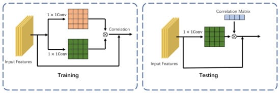 Channel correlation block-computed matrix when training, supporting the matrix during testing.