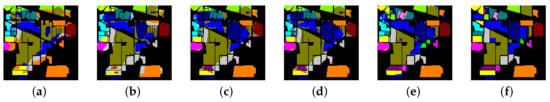 Classification maps of different classification methods on the IP dataset. (a) CNN-2D. (b) CNN-3D. (c) FCN-ELM. (d) Spectral Former. (e) Ours. (f) GroundTruth.