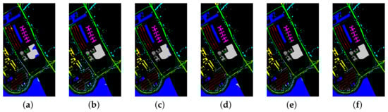 The third experiment’s results are shown in Table 7. Similar to the above two datasets, our method achieved the best performance on the PC dataset. Both the OA and Kappa coefficient were higher than . Each class of the dataset was more accurately classified than the other CNN-based methods. The OA result was higher than the SpectralFormer, while the Kappa coefficient was .