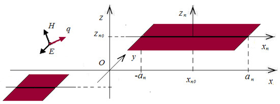 This subsection deals with reformulation of the plane EM wave scattering problem starting from Maxwell’s equations in the vector differential equation form. Let a plane linearly polarized EM wave be incident upon a coplanar system, consisting of zero-thickness electrically conducting flat strips with parallel edges. The strips’ edges will be oriented to the ordinate axis of a Cartesian frame. The transverse cross-section of that coplanar strip system represents an appropriate number of segments or intervals, depending on type of mathematical law. In mathematics, a segment is a closed interval, but an interval (in short) means open interval. It is important for the construction of a pre-fractal set (where segments are used) or a stage of terrible Cantor function, where intervals are used (see Section 4.1). Those intervals have to be placed in the xOz plane upon parallel straight lines. In Figure 1, one can see the simplest coplanar system, which consists of two unequal zero-thickness electrically conducting flat strips, illuminated by the plane E-polarized EM wave. The transverse cross-section of that simplest coplanar system consists of two intervals placed in the xOz plane upon parallel straight lines z = const.