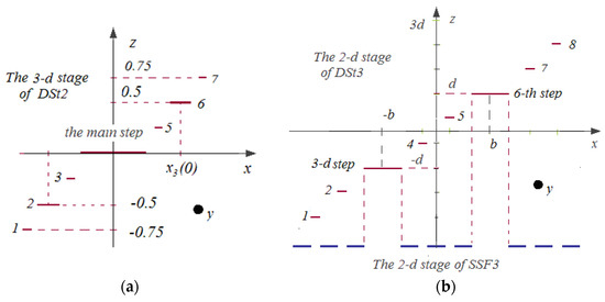 Figure 2a shows a stage of the Cantor function creation procedure constructed on the base of the fourth stage of a triadic perfect set [7,13]. One can see seven intervals corresponding to eight segments of the fourth stage of the triadic perfect set. That Cantor function constructive procedure deals with Smith–Cantor perfect set, as the base for domain of that function definition. Due to the simplest generalization of the Smith–Cantor set, the class of triadic perfect sets with variable fractal dimensions can construct a lot of novel terrible Cantor functions.