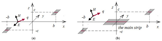 Let us return to the mathematical modeling of the plane E-polarized electromagnetic wave scattering from non-classical coplanar systems of electrically conducting flat strips using the Carleman regularization technique. It is interesting to consider the asymptotic mathematical models of the plane wave scattering for the simplest, sparsely filled coplanar system with a finite number of electrically narrow impedance strips. Figure 3 presents such coplanar strips systems: the first strips system deals with the first stage of a five-part perfect set (see Figure 2b). Here, we have two equal electrically conducting flat strips (see Figure 3a). Normalized input parameters of corresponding E-polarized electromagnetic wave scattering problem have to be under the assumptions: .