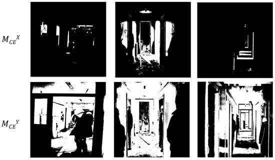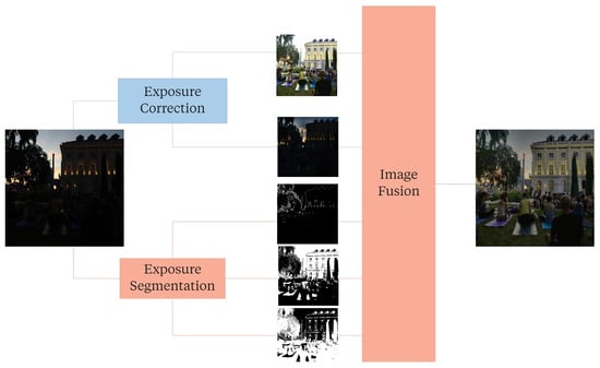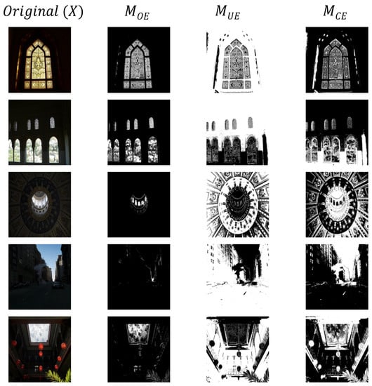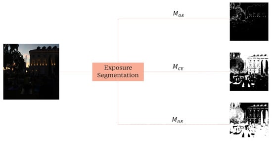 EC outputs complementary results, which need to be merged based on the exposure conditions of the original image. The ES module identifies the overexposed or underexposed regions of the original image, thus allowing the construction of a final image with a more balanced exposure and a wider range of details. Specifically, the module outputs three binary images (, , and ), which refer to the Over, Under, and Correctly-Exposed Masks, respectively (see Figure 4).