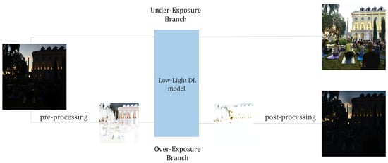 In the following section, we describe the DL framework for exposure adjustment in rescue scenarios. We subdivide it into two parallel branches, namely the Under-Exposure Branch () and the Over-Exposure Branch (), which perform the under- and overexposure corrections, respectively. Both share the same unsupervised DL model designed for low-light image enhancement. In the , we apply the model directly to the original images to correct and recover their dark areas. Instead, for the , we introduce a pre-processing step on the original images to treat the overexposure correction as if it were an underexposure recovery problem. After the application of the model, at the end of , a post-processing step is necessary to restore the original appearance of the images. Further details on the processing procedures are given at the end of this section. The high-level architecture of the EC module is outlined in Figure 2.