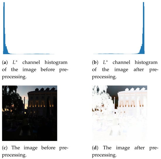 input generation. The image on the left is the original, and the image on the right is after pre-processing. Above each image is the histogram distribution of their lightness () channel. The conversion from (c) to (d) enabled us to treat the overexposure correction as an underexposure recovery problem.