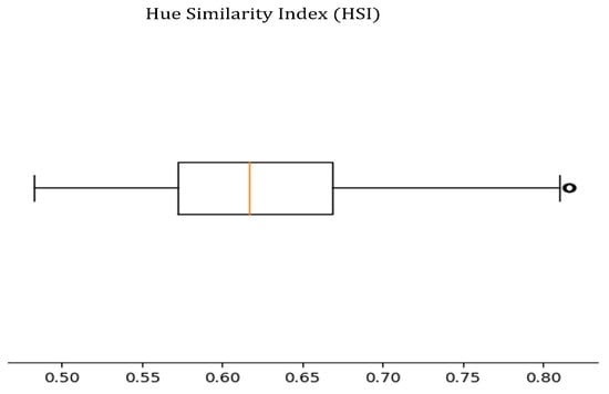 The figure reports the box plot of the Hue Similarity Index (HSI) for the original and corrected hue channels.