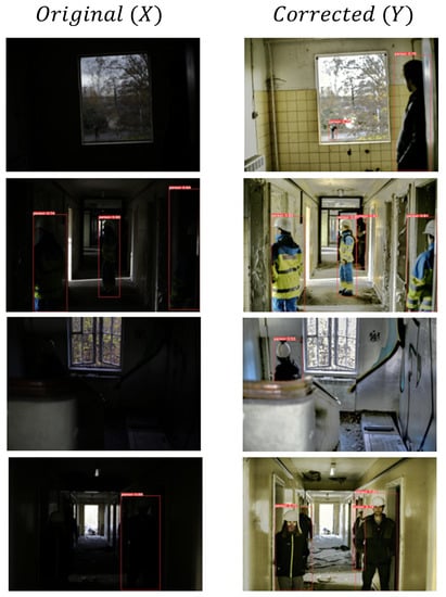 In rescue scenarios, accurately locating and identifying individuals is critical. However, when a scene is not properly exposed, certain features of its objects can be obscured or washed out, making it difficult for the detector to identify them. To test and evaluate the pipeline’s effectiveness in identifying people, we used the YOLOv7 [] object detector, which is a state-of-the-art deep learning model for object detection. Specifically, we used the pre-trained weights of YOLOv7 on the Microsoft COCO: Common Objects in Context data set [], which contains a large number of annotated images of objects belonging to 80 different categories, including people. We applied the detector to both the original and corrected images, to assess its performance in identifying people under different lighting conditions.