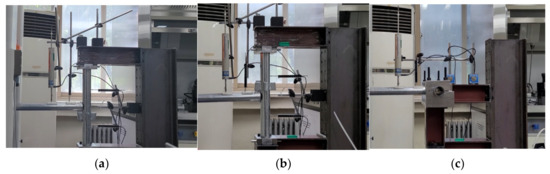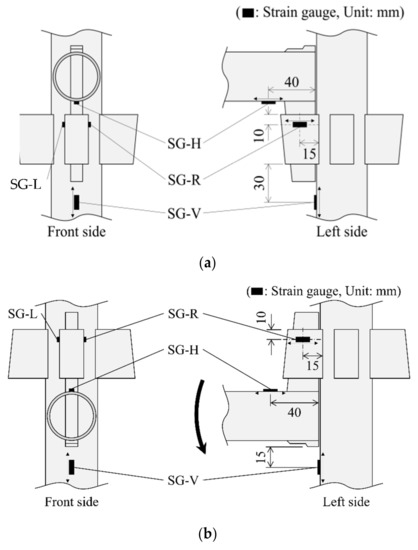 For each rotational direction, load tests were performed on 30 specimens with cantilever beam shapes consisting of system scaffolding vertical members and horizontal members. Figure 2 shows the specimens’ experimental configurations for each load direction. As shown in Figure 3, the method for each experiment was the same as the authors’ previous experiment method [17], and the only difference was the direction in which the specimens were installed. The locations of applied load and displacement gauges (LVDT, Linear Variable Differential Transformers) are shown in Figure 3. To distinguish the experiment results, different specimen names were assigned to each experiment configuration, as shown in Table 3. To check for deformation in specific members, four strain gauges (SG-H, SG-V, SG-R, SG-L) were attached to each of the two specimens for each rotation direction, as shown in Figure 4.