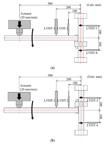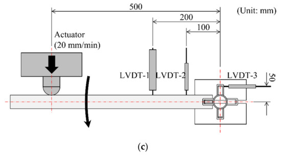 The pocket-type connections have a shape that is horizontally symmetrical along the XZ plane, as shown in the figure in Table 3. To analyze the overall rotational stiffness of the pocket-type connections, it is necessary to examine their behavior when subjected to bending moments in the downward, upward, and lateral directions. This study performed load experiments in which the horizontal member connected to the vertical member was subjected to a bending moment in the clockwise direction with respect to the Y axis (hereinafter “upward rotation”) and a bending moment in the clockwise direction with respect to the Z axis (hereinafter “lateral rotation”). In addition, the results of the authors’ previous study [17] were used for the rotational stiffness when the horizontal member connected to the vertical member was subjected to a bending moment in the counterclockwise direction in reference to the Y axis (hereinafter “downward rotation”).