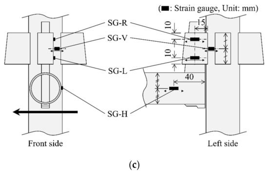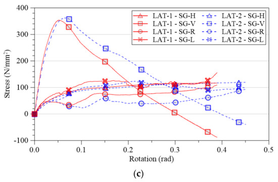 As shown in Figure 11b, the horizontal steel pipe adjacent to the pin was subjected to stronger tensile stress than other locations during the initial stage of upward rotation. After a rotation angle of around 0.03 rad, the vertical steel pipe subjected to compressive stress caved in, and tensile force was generated. As this occurred, the rate of increase in the horizontal steel pipe’s tensile stress decreased. At this time, the stress in the pocket part was within around 70% of the yield strength (211.7 N/mm2). There is a difference between horizontal steel pipe tensile stress (UP-1-SG-H and UP-2-SG-H) under the same experimental conditions. The reason for the decrease in UP-2-SG-H after 0.15 radians is due to the occurrence of cracks in the welded part between the pin and the horizontal steel pipe of UP-2. The tensile force transmitted to UP-2-SG-H decreased due to the occurrence of cracks in the welded joint. However, in the specimen of UP-1, the crack did not occur. Since the specimen with the upward rotation has a relatively strong rotation-resistant capacity, the connection welding of the pin and the horizontal steel pipe can be broken in some specimens. It can be seen that the stiffness of the upwardly rotated connection was influenced more by the material of the vertical steel pipe than the pocket, which is a direct component of the connection. The stress in the laterally rotated connection (Figure 11c) was less than each material’s yield strength at all locations where stress was measured. Based on the pockets’ deformation shapes and the generated stress results, it appears that the stiffness of the laterally rotated connection was determined by plastic deformation or cracks that occurred in welded and bent part of the pocket.