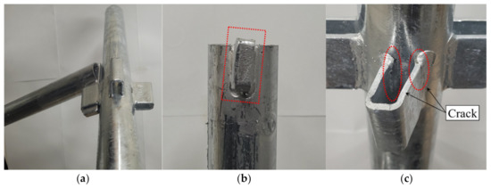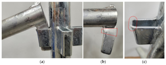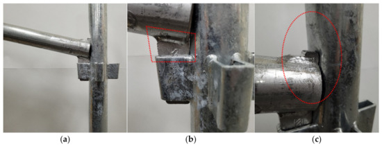 The failure shapes of the specimens were analyzed according to the connections’ rotation directions. Figure 5, Figure 6 and Figure 7 show the failure shapes of the specimens that were subjected to downward rotation, upward rotation, and lateral rotation, respectively. In the case of the downward rotation specimens (Figure 5), the main deformation occurred in the pin and the pocket, which have lower yield strength than the steel pipe, and yielding occurred at the top of the part where the pin and the pocket make contact (Figure 5b,c) in the connection’s structural shape. In addition, slight deformation occurred in the part of the horizontal member steel pipe that made contact with the bottom part of the pin.