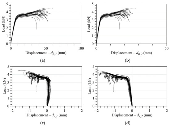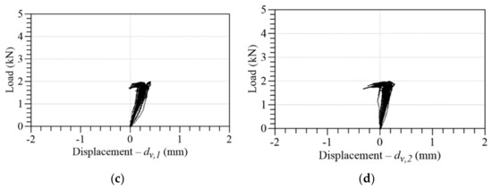 Load–displacement curves of upward rotation: (a) LVDT-1; (b) LVDT-2; (c) LVDT-3: (d) LVDT-4.