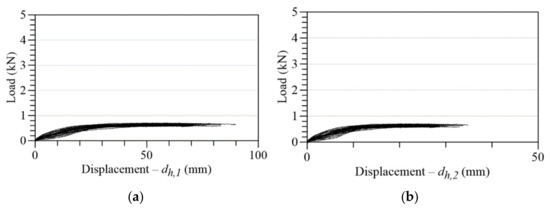 Figure 8, Figure 9 and Figure 10 show load–displacement curves of the connection specimens according to the load direction. As shown in the figures, the upward-direction specimens had the greatest load-displacement capacity, followed by the downward-direction specimens. The lateral-direction specimens were found to resist a low level of moment. For the downward rotation specimens (Figure 8), initial sliding occurred in some specimens due to the slip in the contact section between the pin and the vertical steel pipe. However, there is no problem in calculating the moment-rotation curve since the position of the rotational axis, which is the intersection point of the horizontal pipe’s central axis and the vertical pipe’s central axis, remained almost unchanged. The yield of the specimen occurred at the pocket in contact with the pin. Since the yield strength of the pocket was the smallest compared with other parts, the yield strength of the pin seems to have dominated the yield strength of the specimen. The yield of specimens occurred at a load range of 1.22 kN–1.91 kN (Average = 1.39 kN, S.D. = 0.06 kN), where the top part of the pocket started to yield. As the load increased, the top part of the pocket was bent and reached its ultimate state, as shown in Figure 5. The maximum loads were in the range of 1.64 kN–2.00 kN (Average = 1.87 kN, S.D. = 0.08 kN).
