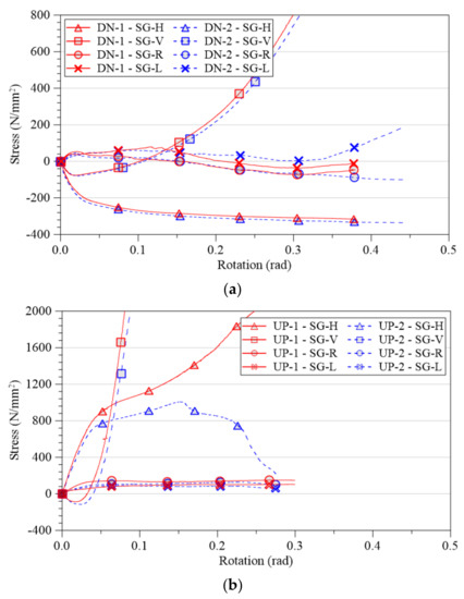 In the case of the downward rotation (Figure 11a), continuous compressive stress occurred after applying a load at the point of the strain gauge (SG-V) attached to the horizontal member steel pipe. The maximum compressive stress at the location where the strain gauge was attached to the horizontal member steel pipe (DN-1–SG-H: 316.7 MPa, DN-2–SG-H: 335.8 Mpa) was less than 50% of the yield strength of the horizontal member steel pipe material (698.0 Mpa). In the case of the measurement point where the strain gauge (SG-H) was attached to the vertical member steel pipe, compressive stress occurred in the initial rotation part, but after the maximum compressive stress, the stress reversed and became tension. The tensile stress that occurred afterward increased continuously and attained a yield strength (639.0 Mpa) around the point where the connection’s maximum moment was reached. It was found that plastic deformation occurred in the steel pipe as the lower part of the pin pressed on the vertical member steel pipe due to the rotation of the connection, but it was determined to be a minor degree of deformation compared to the deformation of the pin when the shape of the connection was examined after the end of the experiments (Figure 8). The stress that occurred at the strain gauges attached to both sides of the top part of the pocket (SG-R, L) was smaller than the stress that occurred in the steel pipe, and the difference in the stress that occurred on the left side and the right side was small in both the DN-1 and DN-2 specimens.