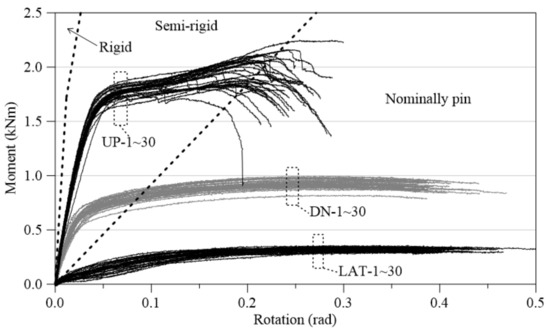 Figure 13 shows the moment–rotation relationships calculated for all specimens, and Table 4 shows the means and standard deviations of the maximum moment for each connection rotation direction. In the literature, connections are classified as rigid, semi-rigid, and nominally pin according to their rotational stiffness. These classifications correspond to the three regions divided by the dotted lines in the moment–rotation curve graph in Figure 13. The dotted lines are defined according to Eurocode 3 [19]. The specimens’ moment–rotation curves each show differences according to the rotation direction. The specimens that showed the maximum moment were the upwardly rotated specimens, and the mean was 1.942 kNm. In the case of upward rotation, the moment–rotation curves rapidly decreased after the maximum moment occurred (approximately 0.19–0.27 rad). It seems that the rotational stiffness, which corresponds to the slope of the moment–rotation curve, rapidly decreased at around 0.03 rad before the maximum moment occurred. The rotation angle of 0.03 rad indicates the time at which denting occurred in the vertical steel pipe, and the vertical steel pipe significantly affected the rotational stiffness of the upwardly rotated connection. There was no noticeable deformation of the pocket during the loading of upward rotation. When the contact section of the vertical steel pipe with the end of the horizontal steel pipe yielded, the moment-rotation curve showed the yielding. The maximum capacity was derived from the ultimate capacity of vertical steel pipe in local bending.