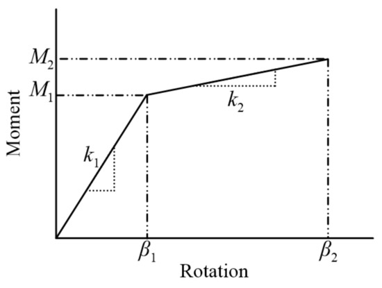 Scaffolding design typically focuses on providing adequate structural integrity, stability, and load-carrying capacity while adhering to recognized industry standards, codes, and regulations. In the case of general scaffolding design, there is no need to consider the yield deformation capacity of connections where the connections are assumed to be hinges. However, in the case of investigating the accurate ultimate behavior of the scaffolding and identifying vulnerable components under various loads, it is necessary to consider the plastic deformation capacity of connections. The moment–rotation curves of the pocket-type connections do not show any initial rotation angle looseness [13] owing to the shape of the connections and the method of tightening by hammering the members, etc. Therefore, in this study, the rotational stiffness models for the pocket-type connections were assumed to have a bilinear form similar to the actual moment–rotation curves. Figure 14 defines the rotational stiffness values (, ) and reference rotation angles (, ) that are parameters of the assumed bilinear rotational stiffness model. If the simple mean of the values of each specimen’s bilinear rotational stiffness model are used as the mean value of , which is the reference for changing rotational stiffness, the continuity of each rotational stiffness cannot be guaranteed. Therefore, as shown in Equation (4), the mean of was calculated as a weighted mean using the initial rotational stiffness () as a weight value.