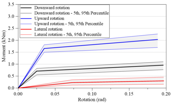 Figure 15 and Table 5 show the major parameters of the bilinear rotational stiffness model for each rotation direction of the pocket-type connections, which were derived from the results of experiments in this study and the authors’ previous study [17]. Research has been conducted on the reliability analysis of scaffolding structures [20,21,22]. In order to provide statistical characteristics of random variables for the rotation stiffness that can be used in the reliability analysis of scaffolding structures, the derived bilinear rotational stiffness model for pocket-type connections also includes the rotational stiffness’ (, ) coefficient of variation and 5th and 95th percentiles, along with the mean values of the parameters. In the rotational stiffness model of the downwardly rotated connections, the mean of the initial rotational stiffness (, rotation range: 0.000–0.025 rad) was 28.378 kNm/rad, and the mean of the post-yield rotational stiffness (second rotational stiffness, , rotation range: 0.025–0.196 rad) was 1.450 kNm/rad. In the rotational stiffness model of the upwardly rotated connections, the mean of the initial rotational stiffness (, rotation range: 0.000–0.035 rad) was 47.138 kNm/rad, and the mean of the second rotational stiffness (, rotation range: 0.035–0.169 rad) was 2.461 kNm/rad. In the rotational stiffness model of the laterally rotated connections, the mean of the initial rotational stiffness (, rotation range: 0.000–0.073 rad) was 3.144 kNm/rad, and the mean of the second rotational stiffness (, rotation range: 0.073–0.197 rad) was 0.577 kNm/rad. However, the coefficient of variation of the initial rotational stiffness of the laterally rotated connections was very large compared to the other rotational stiffness values, indicating some uncertainty. However, it can be considered a nominally pin connection when performing analyses according to Eurocode 3 [19].