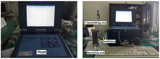 The designed specimen size ensured that the blasting stress wave fully acted on the tunnel after it was completely propagated in the surrounding rock. In the model, the tunnel arch radius is 5 m, the height from the tunnel floor to the arch shoulder is 5 m, and the distance between the #1 blasting source, #2 blasting source, and #3 blasting source and the tunnel arch center is 20 m, with the same charge, so that the blasting stress wave can fully act on the surrounding rock to disturb it. The propagation medium is sandstone, and the P-wave and S-wave speeds of the sandstone were measured by a Sonic Viewer-SX device, as shown in Figure 3. According to the P-wave and S-wave speeds, the dynamic elastic modulus and the dynamic Poisson’s ratio were obtained. The dynamic physical properties of sandstone are shown in Table 1.