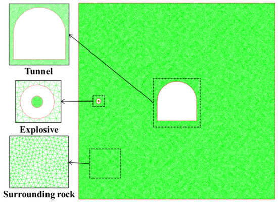 The numerical model is established according to the size of the engineering simplified model, and AUTODYN finite difference software is used for numerical simulation. The 3D model was established and divided into 600,237 tetrahedral mesh cells. Four sizes, 1.5 mm, 1 mm, 0.5 mm, and 0.25 mm, were used in the convergence study, and the size 0.5 mm was used in this study. The mesh at the blasting source and the tunnel side was densified and refined. The model cell division is shown in Figure 5.
