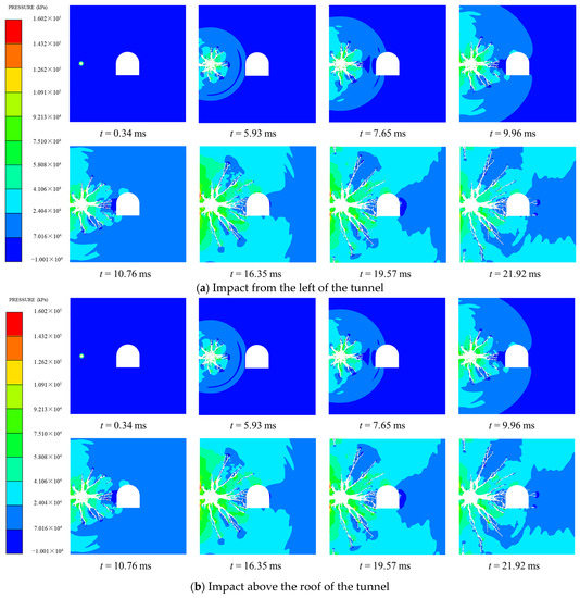 As can be seen from Figure 8, the pressure on the blasting side of the tunnel is the largest, and the maximum pressure is mainly concentrated at the arch foot and arch shoulder. For example, when the blasting source was located from the left side, the pressure at monitoring point #3 located at the arch foot was 48.72 MPa. When the blasting source was located above the roof, the pressure at monitoring point #1 located at the arch shoulder was 23.76 MPa. When the blasting source was located below the floor, the pressure at monitoring point #3 located at the arch foot was 48.76 MPa. From the perspective of pressure distribution, when the blast-facing side is an arch, the distribution of compressive stress at the arch is more uniform compared to the other two situations, and the average compressive stress around the roadway is also smaller. The arch can better resist impact loads such as blasting.